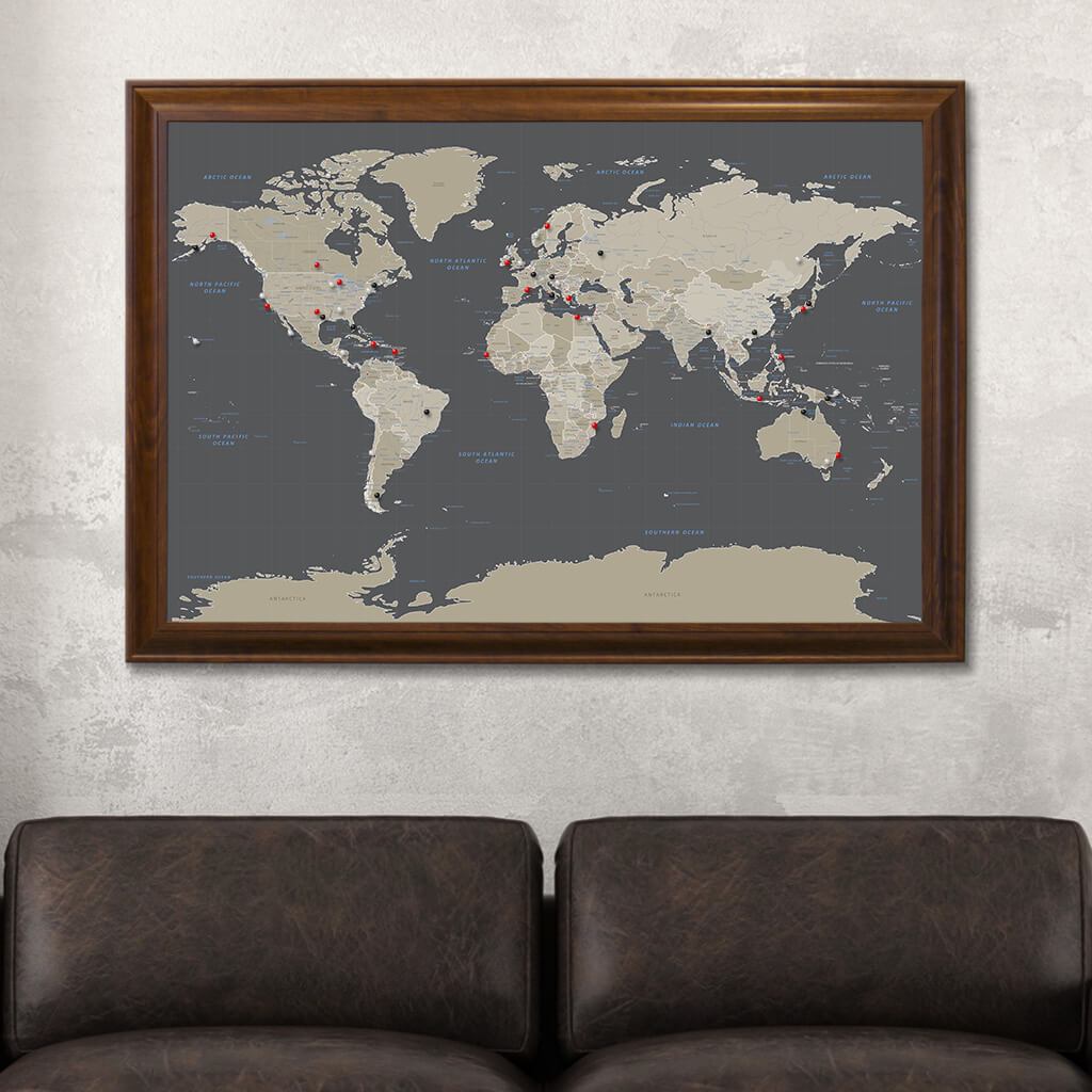 Earth Toned World Map | World Map in Frame | Push Pin Travel Maps